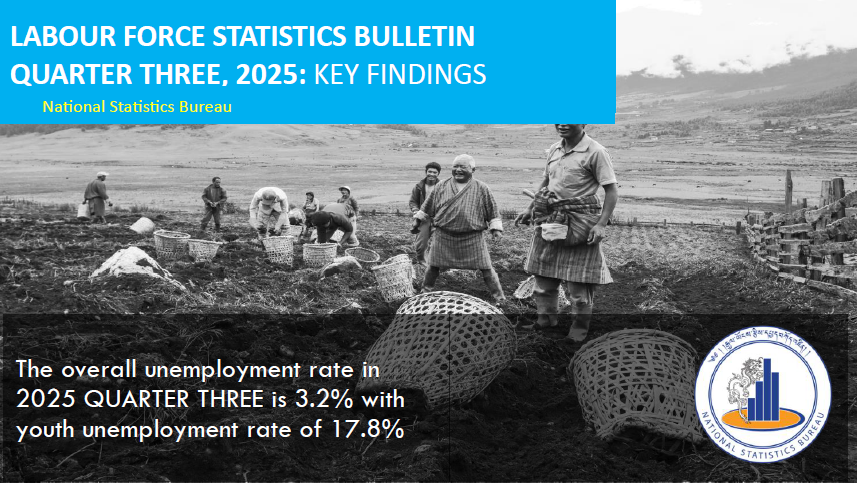 Bhutan’s overall unemployment rate has risen marginally to 3.2 percent in the third quarter of 2025, compared to 2.9 percent recorded in the previous quarter, according to the Labour Force Statistics Bulletin released by the National Statistics Bureau (NSB). Despite the increase, the Bureau stated that “the overlapping confidence intervals indicate that the observed difference is not statistically significant.” However, the persistence of high youth unemployment remains a major concern, with the rate standing at 17.8 percent, more than five times higher than the national average.